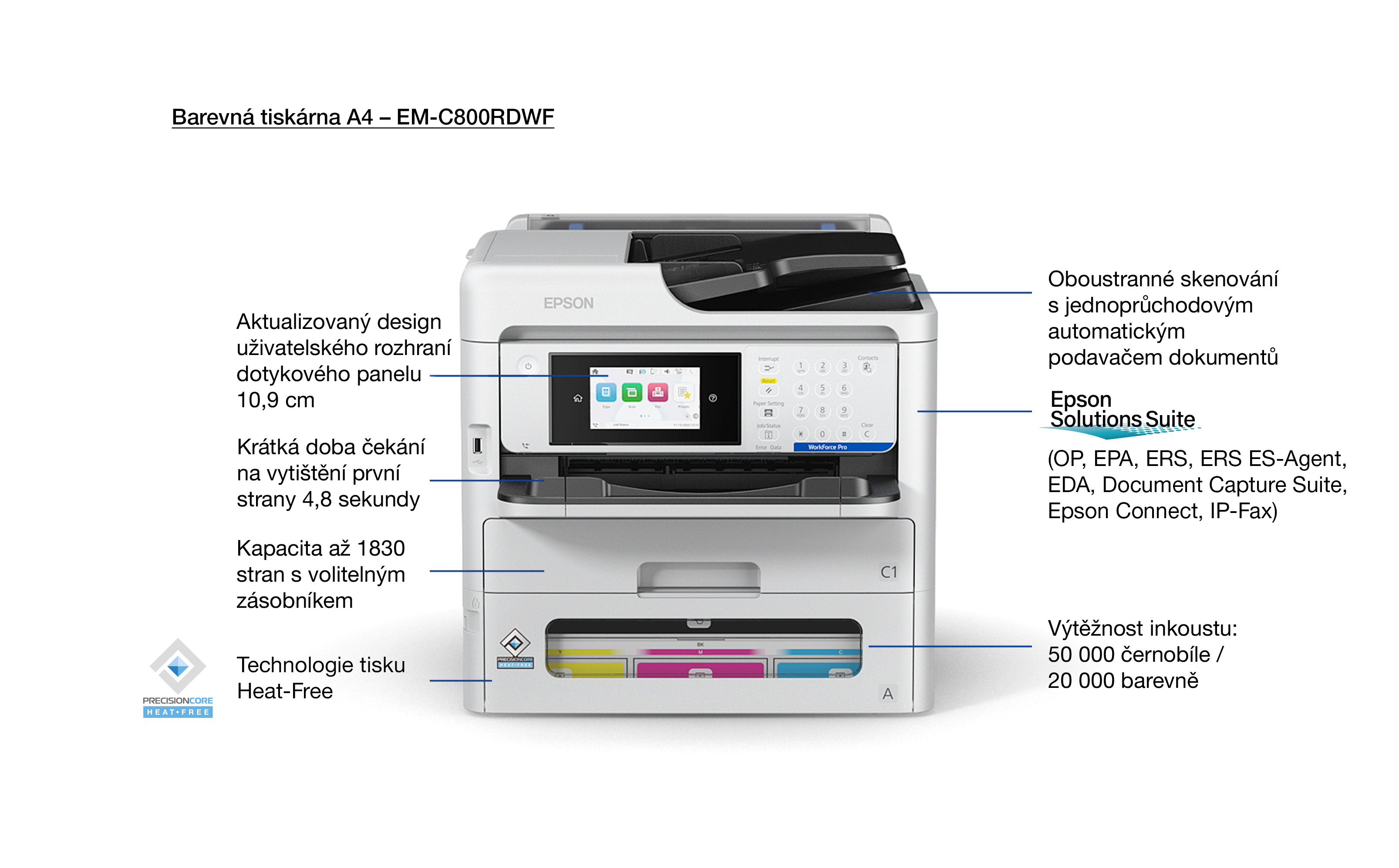 Model EM-C800RDWF byl navržen s ohledem na účinnost a nabízí nízkou spotřebu energie1. Přechodem na technologii tisku Heat-Free, která při nanášení inkoustu nevyužívá žádné teplo, můžete ušetřit energii, ušetřit čas a nutnost zásahů.