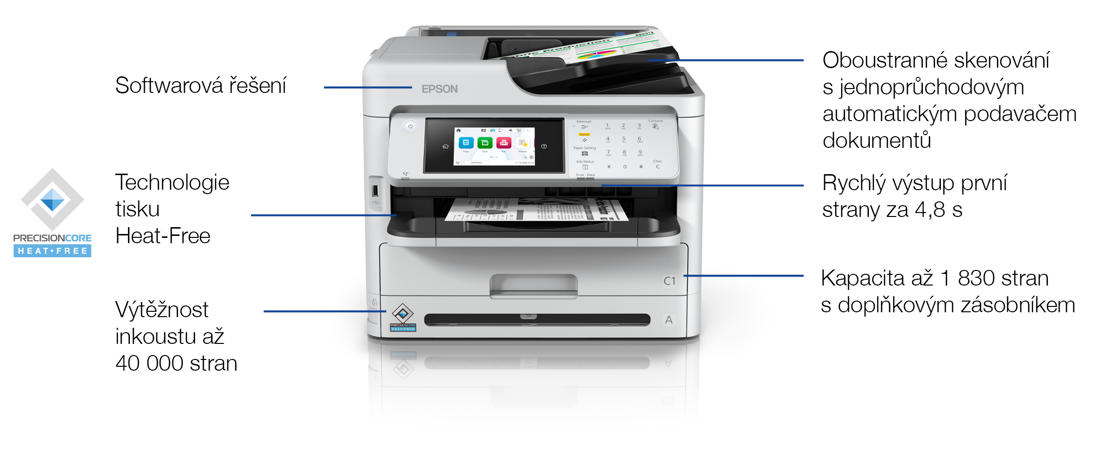 | Rychlost skenování (ADF) | Jednostranně: 30 str./min | Oboustranně: 60 str./min (čb i barevně) |
