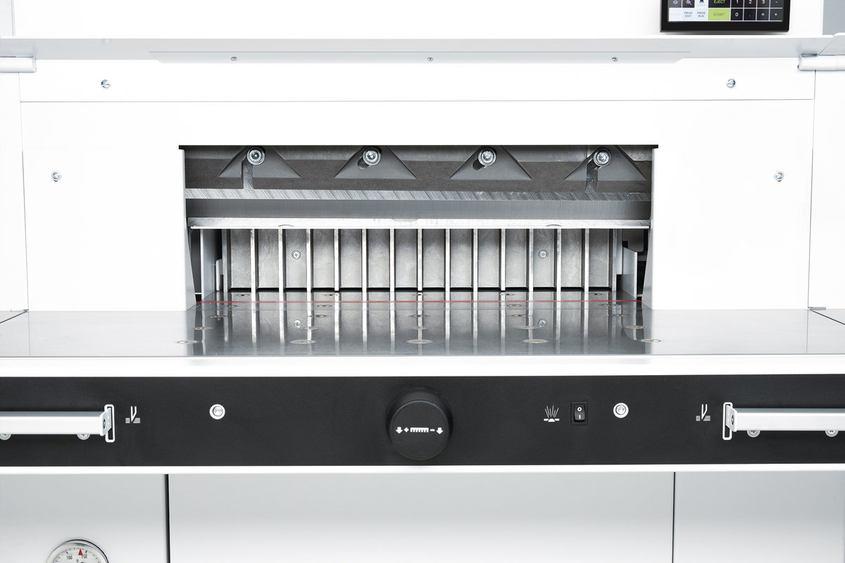 Hydraulický pohon nože a lisu. Vybaveno novými technologiemi - patentovaný EASY - CUT aktivace nože pomocí lišty a bezpečné řezání. Ergonomická pracovní výška 94 cm zaručuje snadnou obsluhu.Vybaven SCS bezpečnostním balíčkem: výklopná, elektronicky řízená světelná závora na předním stole bezpečnostní kryt na zadním stolehlavní vypínač a bezpečnostní zámek s klíčem elektronicky řízeným do skutečného provozu dvouručním ovládáním kontrolní prvek 24 voltů (nízké napětí) bezpečnostní zastavení nože a lisu, návrat z každé pozicekotoučová brzda pro okamžité zastavení nože čepel změnou zařízení s krytou ostří nože nastavení hloubky z vnějšku stroje jednoduchá výměna nože s bezpečným uložením do ochranného krytu a snadná výměna řezné lišty bez rizika zranení. Elektronické nastavení zadního dorazu pomocí dotykvého ovládání pro snadné nastavení vícejazyčné vedení obsluhy s digitálním displejem. Měření odečet v cm nebo palcích ( displej s přesností na 1/10 mm nebo 1/100 palce ) . 99 programů s 99 kroky v každém programu ( až 15 opakování řezu mohou být integrovány do programu, jako jediný krok programu ). Program se spustí automaticky . 10 tlačítek pro rychlé nastavní rozměru. Předprogramované míry pro A3 až A6 standardní formáty papíru. Paměť klávesnice pro opakované řezy.Funkce automatického SET pro referenční měření pomocí tlačítka START. Programovatelné EJECT funkce - pro vysunutí papíru.Self -diagnostický systém s chybovým hlášením na displeji. Elektronické ruční kolečko pro manuální nastavení zadníhod orazu s plynulou regulaci otáček ( od velmi pomalé až velmi rychlý ) .Ovladač pro nastavení tlaku (min. 200 / max. 1.100 daN) a manometr. Lišta pro řezání choulostivých materiálů. Nůž z vysoce kvalitní HSS oceli Masivní ocelový unašeč nože, nastavitelné usazení. Nastavitelný zadní doraz s úzkými separátory a plastovými kluzáky. Optická řezná linka s jasným a trvanlivým LED paprskem. Boční pevné dorazy. Pevná celokovová konstrukce. Kompletní s podstavcem, skladovací policí, praktickým držákem nástrojů. Volitelná sada bočních stolků je k dispozici za příplatek. Předlis - ano Nožní předlis - ano Přípojná hodnota 230 V / 50 Hz Typ lisu - hydraulický Výška stohu - 95 mm