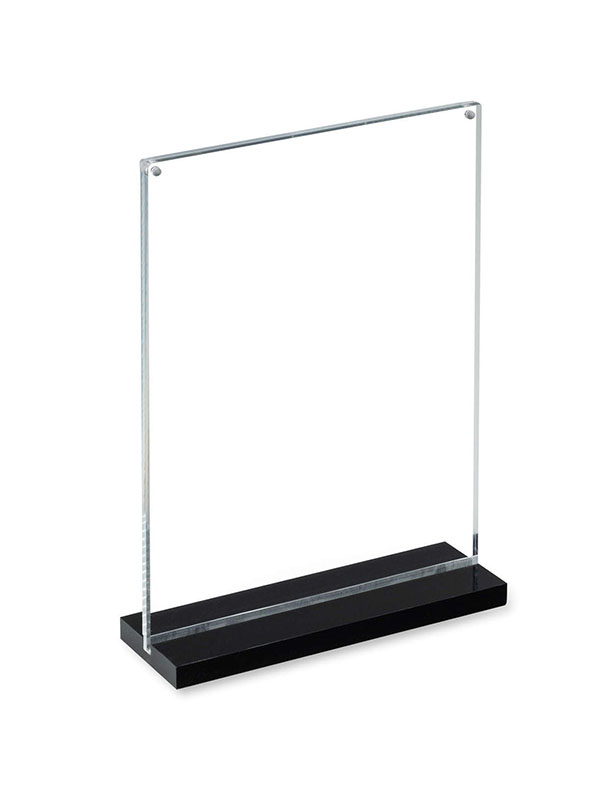 Elegantní oboustranný akrylový stojan. Široká základna zajišťuje stylový vzhled a stabilitu. Grafiku lze vyměnit doslova během několika vteřin jejím vložením mezi dva magnetické panely. Stojan je ideální pro použití ve veřejných prostorách, např. v restauracích, bankách a hotelech.Síla plexiskla: 5 mm